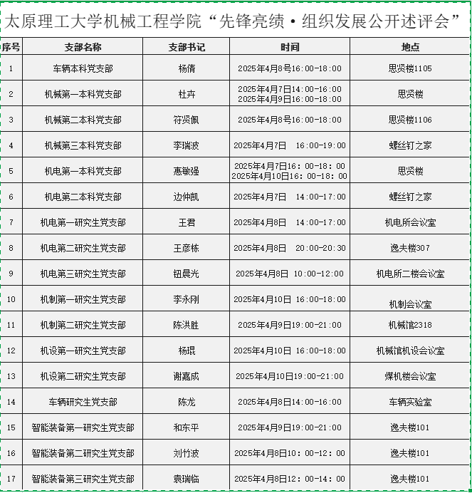 各支部“先锋亮绩·组织发展公开述评会”时间地点公告如下,欢迎各位老师、同学们莅临监督、观摩指导!