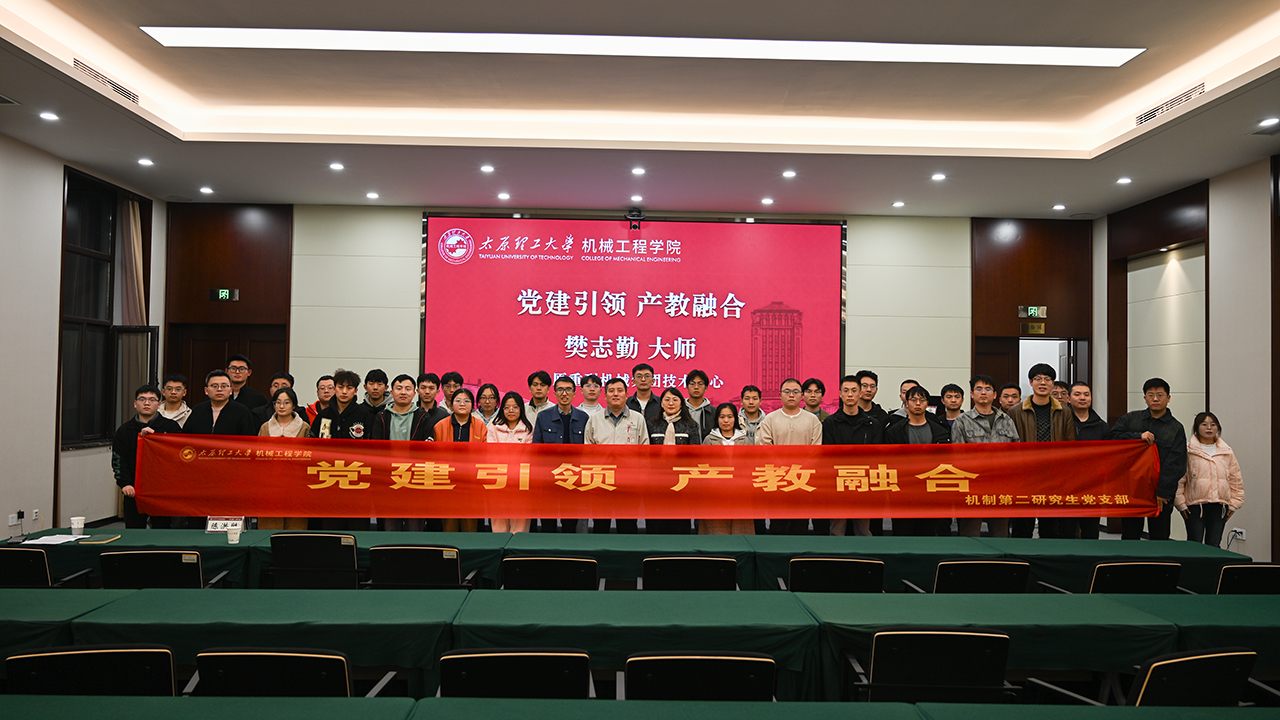 2025年10月21日,机制第二研究生党支部在迎西校区会议中心一层举办“党建引领 产教融合”专题活动。本次活动特邀太原重工技术中心焊接专家、全国劳动模范、“大国工匠”樊志勤担任主讲人。支部全体党员及同学员积极参与,现场气氛热烈,座无虚席。