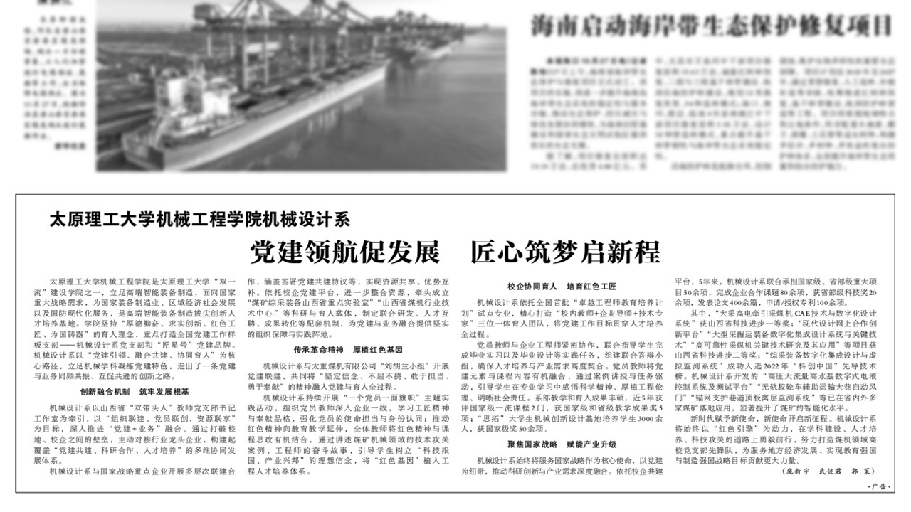 机械设计系与国家战略重点企业开展多层次联建合作,涵盖签署党建共建协议等,实现资源共享、优势互补。依托校企党建平台,进一步整合资源,牵头成立“煤矿综采装备山西省重点实验室”“山西省煤机行业技术中心”等科研与育人载体,制定联合研发、人才互聘、成果转化等配套机制,为党建与业务融合提供坚实的组织保障与实践阵地。