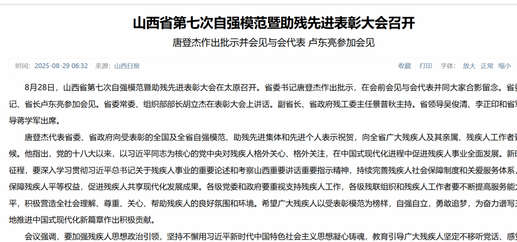 山西日报:山西省第七次自强模范暨助残先进表彰大会召开